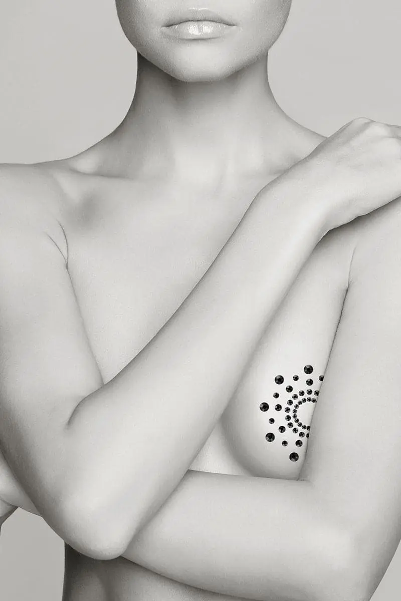 Cette paire de bijoux de corps est composée de strass noirs à poser en corole autour de chaque mamelon.