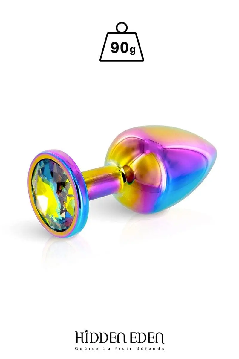 Plug bijou fabriqué par la marque Hidden Eden. Ce sextoy anal extra lisse est fabriqué en aluminium effet arc-en-ciel, il pèse 90 grammes pour une longueur de 8,1 cm et un diamètre maximum de 3,2 cm.