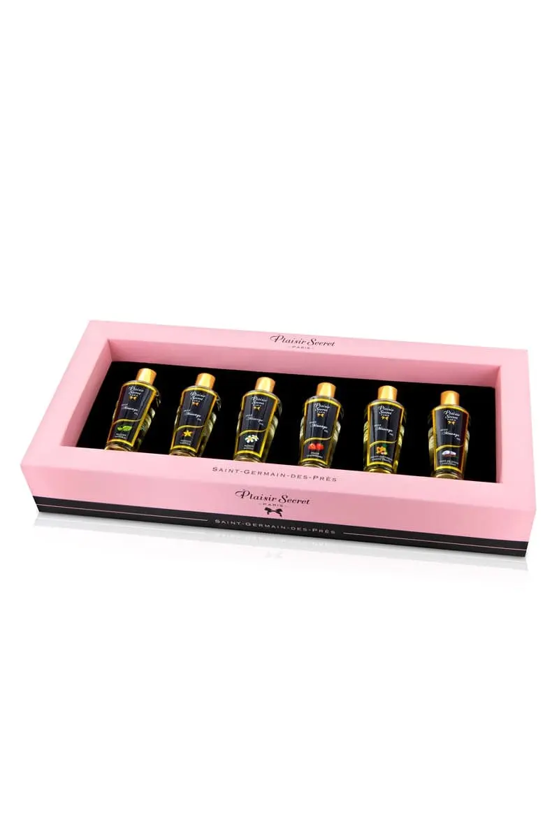 Coffret cadeau huiles de massage sèches Plaisir Secret avec 6 parfums disponibles : Monoï, Vanille, Fruits Exotiques, Noix de Coco, Fraise et Naturel.