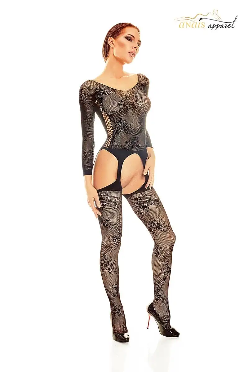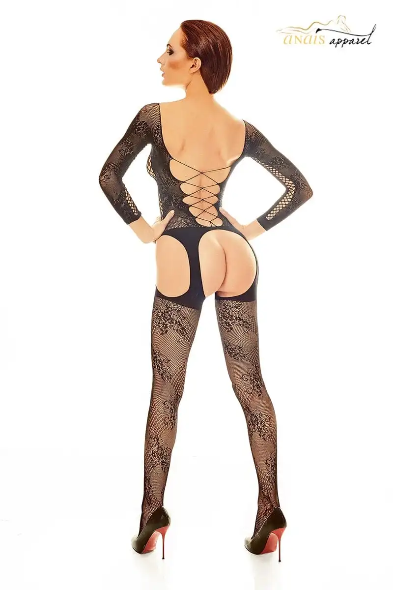Combinaison sexy en résille noire à manches longues, dos nu finition croisillons, et ouvertures style jarretelles sur les hanches.