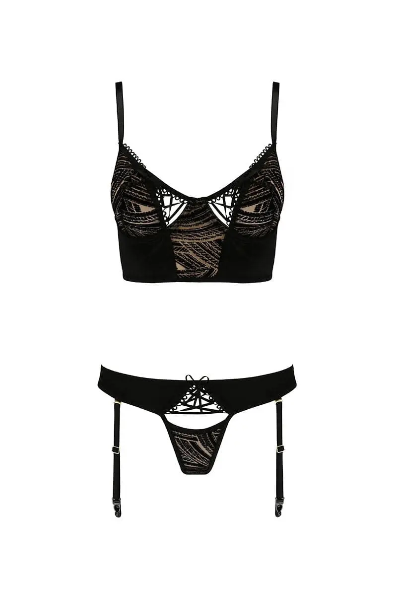 Ensemble de dessous féminins comprenant une culotte à jarretelles et un soutien-gorge bustier. Collection Lara, par Casmir.