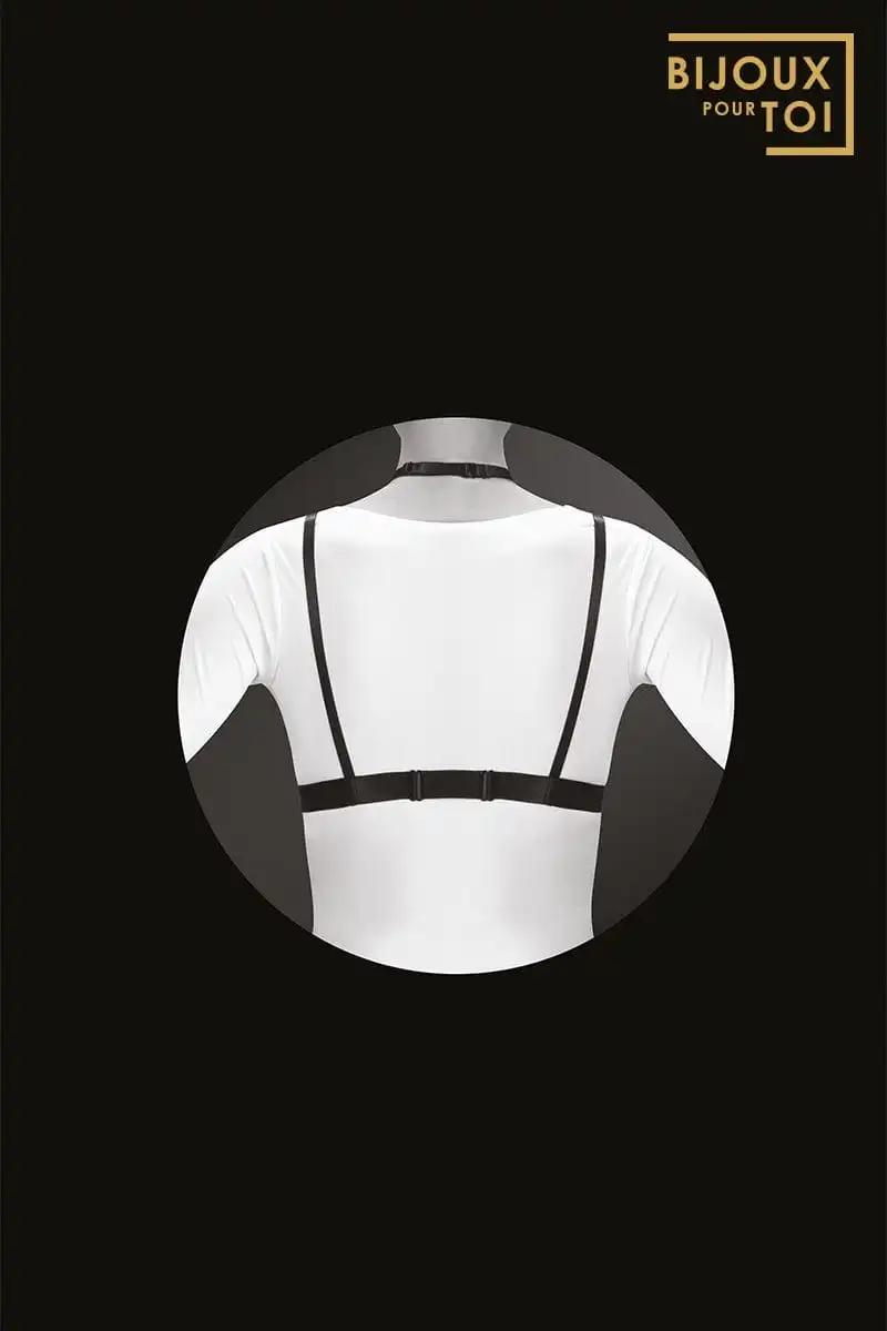 Harnais noir composé de lanières douces et élastiques pour souligner votre poitrine.