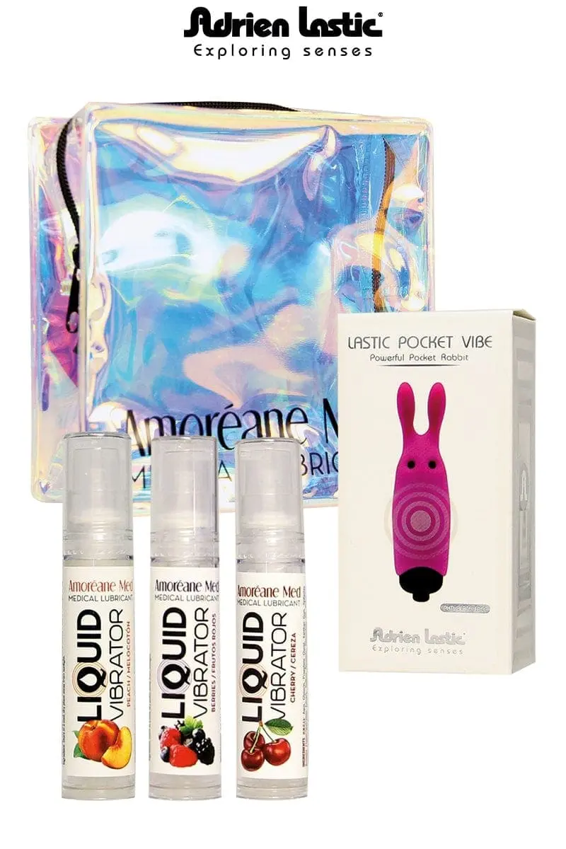 Pack promo contenant 1 mini vibro stimulateur de clitoris rose Lastic Pocket Vibe + 3 lubrifiants intimes à base d’eau (10 ml) Amoréane Liquid Vibrator contenant les parfums suivants : pêche, fruits rouges, cerise.