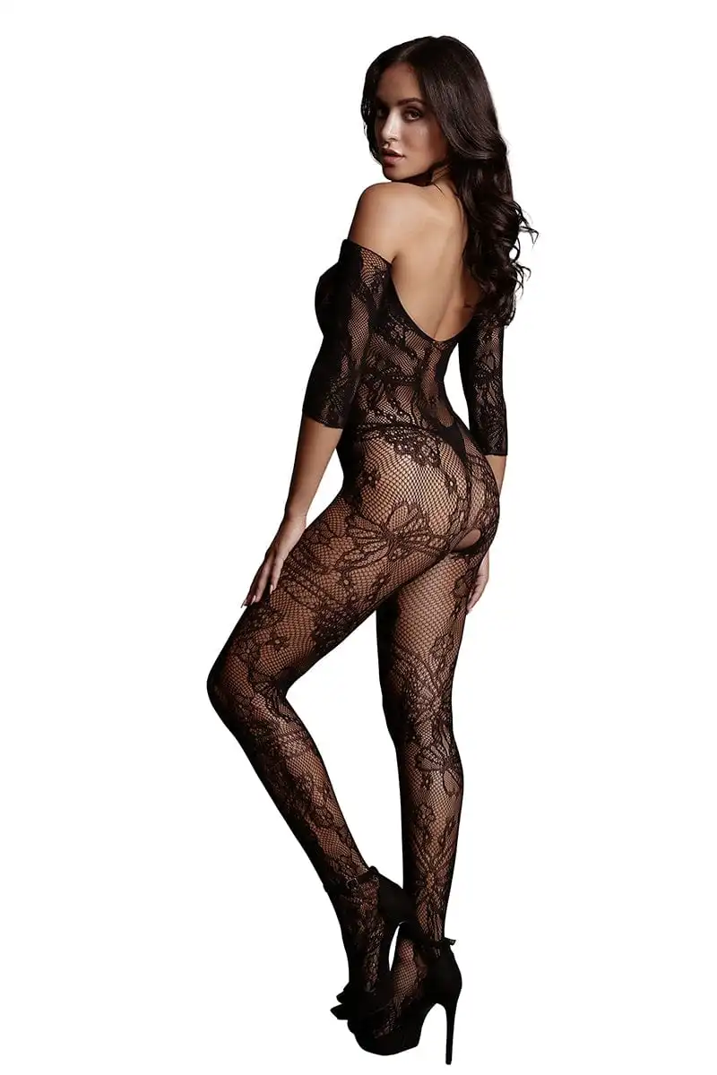 Combinaison sexy manches longues en résille florale avec ouverture intime à l’entre-jambes.