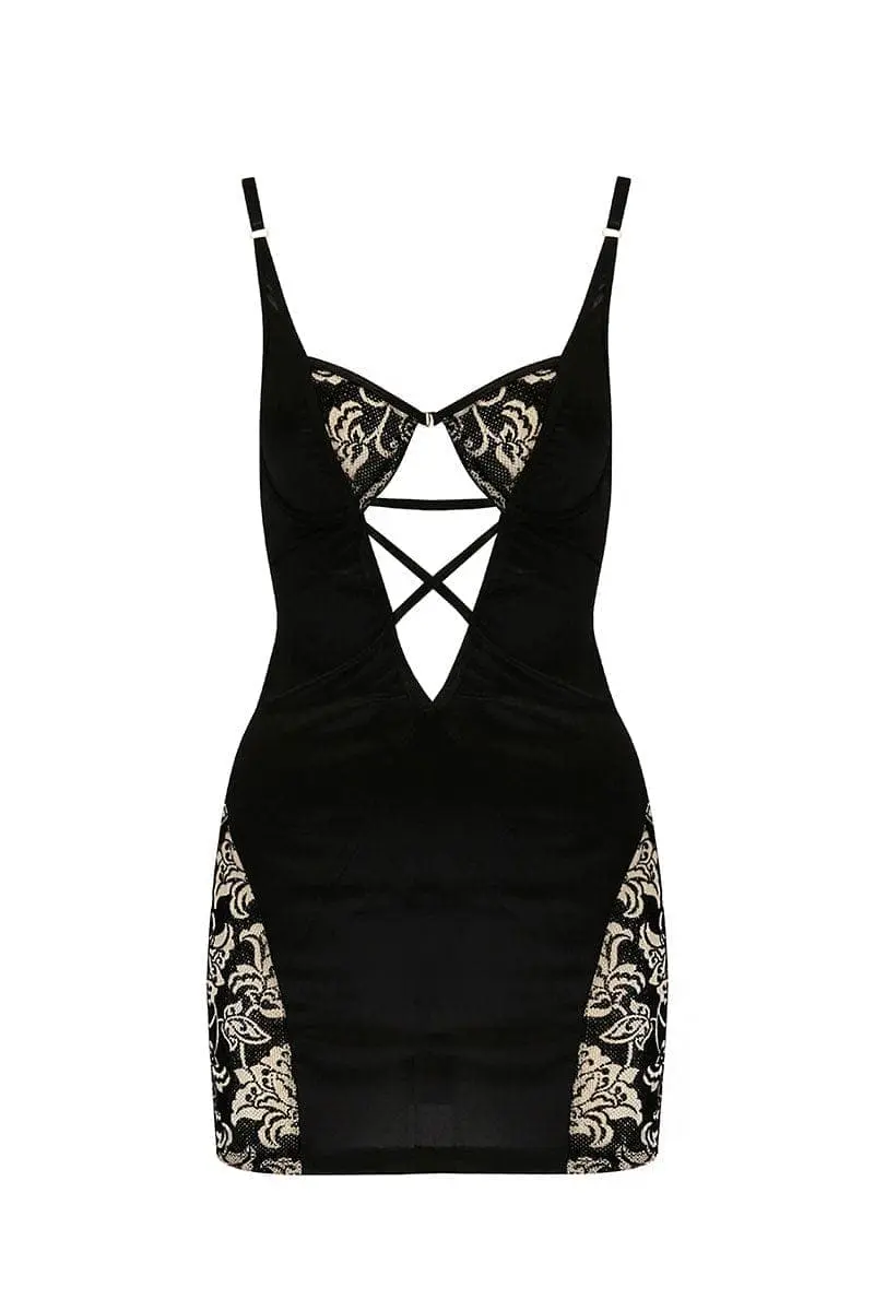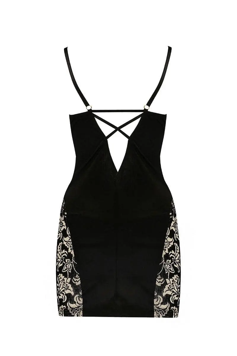 Fourreau moulant noir opaque, cette petite robe courte d’intérieur est éclairée devant par une résille bicolore noire et or qui dessine un motif baroque sur les seins et les hanches. Le soutien-gorge à armatures finition balconnets met en valeur la poitrine.