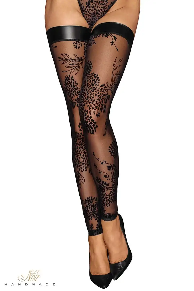 Une paire de bas sexy sans pied en tulle floqué motif florale retenus par une jarretière en wetlook noir