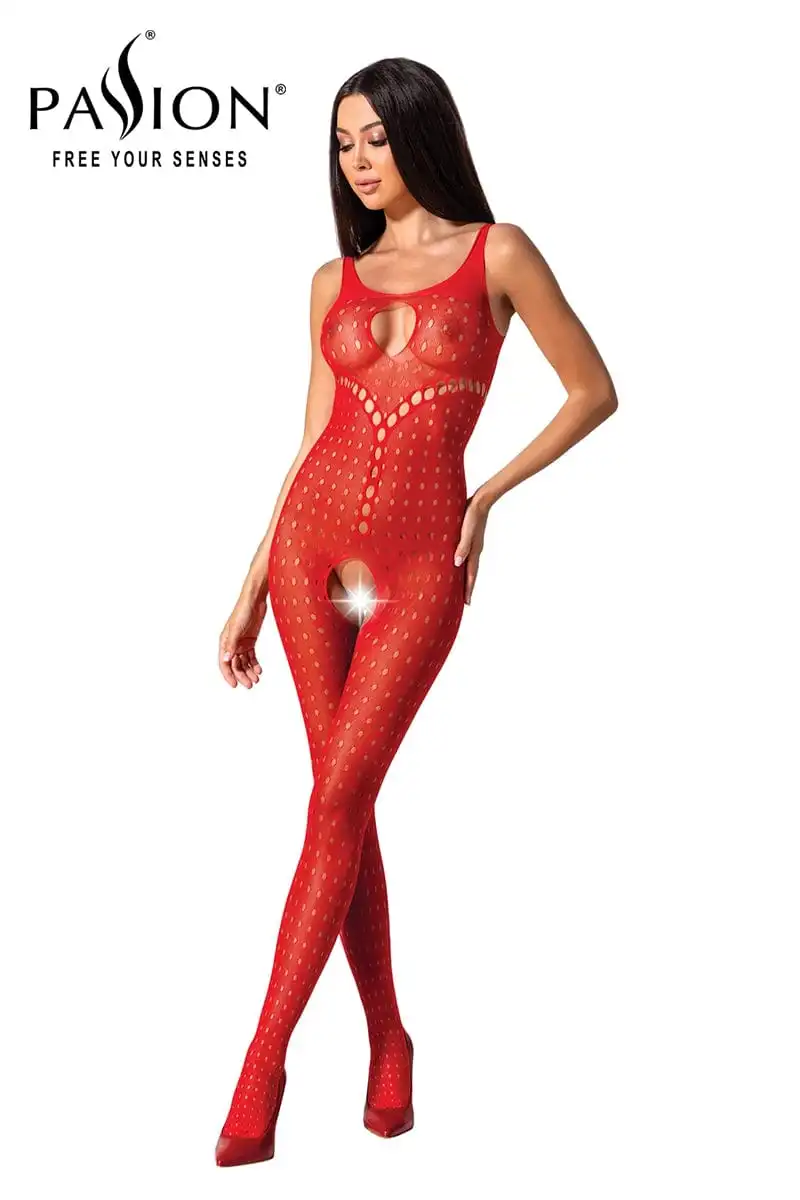 Combinaison rouge ouverte en résille à motif pois de la marque Passion.