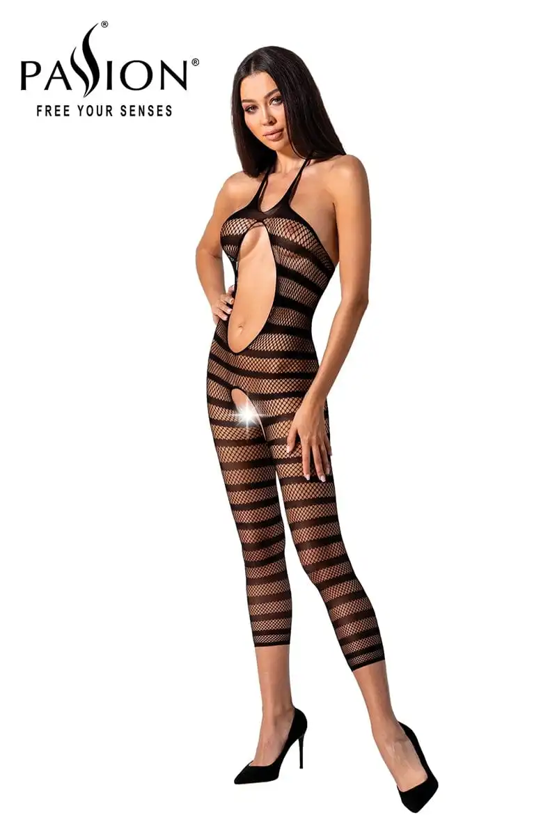 Combinaison sexy ouverte en résille rayée, finition leggings à mi-mollet.
