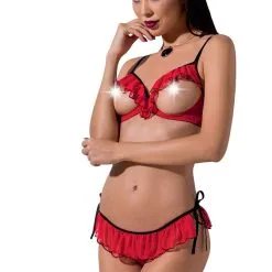 Enfilez cet ensemble de lingerie sexy plutôt provocant en tulle rouge composé d’un soutien-gorge avec les seins seins nus et d’un petit string à volants assorti